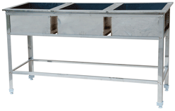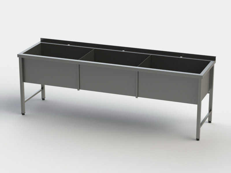 Ванны котломоечные трехсекционные из нержавеющей стали предназначены для мытья варочных котлов и кухонной посуды. Ванна моечная котломойка изготавливается из листовой нержавеющей стали AISI 430 толщиной 1,5 мм и профильной трубы 40*40 мм. Емкость ванны - сварная.