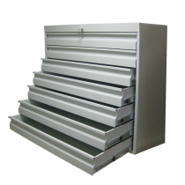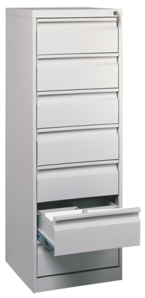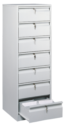 Шкафы картотечные - это металлические тумбы с выдвижными ящиками. Картотечный шкаф предназначен может применяться как для хранения документов различных форматов (от А6 до А1), чаще всего для стандартных бумаг размером А4, карточек и личных дел сотрудников, трудовых книжек (форматы А6, А5), медицинских книжек (карточек пациентов) в регистратуре поликлиники и больницы, а также при оборудования файловой картотеки. Шкафы картотечные изготавливаются различных моделей. Каждое изделие имеет от 1 до 7 выдвижных ящиков. Для хранения чертежей используется картотека СТК 7/А1 (для формата А1). Запирание картотечных ячеек осуществляется на встроенный замок повышенной секретности. Все шуфляды могут запираться на центральный (один общий) запирающий механизм, так и иметь отдельный замок для каждой шуфляды. Шкафы картотечные имеют телескопические направляющие, которые выдерживают большую нагрузку, чем обычные роликовые, а также позволяют выдвигать ящики полностью. Для хранения большого объема документов в ящиках, коробках или папках "Дело" и "Корона" обратите внимание на шкаф архивный металлический , а также металлические стеллажи , которые станут недорогим и отличным решением для хранения документов в офисе. Картотечные шкафы предназначены для систематизации и удобного хранения: - документов формата А-4; - файловых папок, трудовых книжек; - карточек формата А-6, А-5; - компакт дисков и видеокассет; - материальных ценностей, инструмента; - конструкторской документации формата А-1; - денег (тумба кассира ТК3). Они широко используются в банках, офисах, регистратурах медицинских учреждений, архивах, отделах кадров государственных и частных предприятий. В крупных организациях для сортировки входящей и внутренней корреспонденции устанавливают абонентский шкаф, таким образом, у каждого сотрудника есть своя почтовая ячейка. Купить в Минске картотечные шкафы для хранения чертежей и другой документации по лучшим ценам Вы можете у нас. Мы можем доставить картотеки в любой город Беларуси: Минск, Брест, Гродно, Гомель, Витебск, Могилев. Характеристика картотечных шкафов серии ТК: - жесткая сварная конструкция шкафа, позволяющая осуществлять удобную и быструю установку, транспортировку шкафа без дополнительных работ по сборке; - наличие общего центрального или индивидуального для каждого ящика замка повышенной секретности EURO LOCKS; - телескопические направляющие с допустимой нагрузкой на ящик до 25 кг; - качественное полимерное покрытие (стандартное покрытие- RAL 7035, светло-серый). |