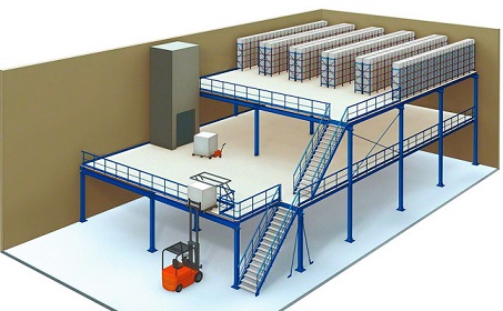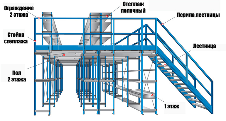 Мезонинные стеллажи позволяют одновременно производить хранение грузов на полках (на втором этаже стеллажа), где может быть использована ручная загрузка, так и на поддонах с применением автоматизированной погрузочной техники (на нижнем ярусе). Полочный мезонин обеспечивает возможность одновременно работать на нескольких этажах. Лестницы с перилами и ограждения обеспечивают доступ и безопасную работу на втором и третьем этажах стеллажной системы. Несущая способность стеллажей подтверждена многократными регулярными успешными испытаниями продукции. Мезонин складской – это идеальное решение для оборудования складского помещения с высотой потолков от 4 метров. Двухъярусный полочный мезонин позволит увеличить полезную площадь склада вдвое. |